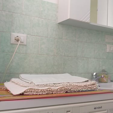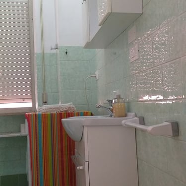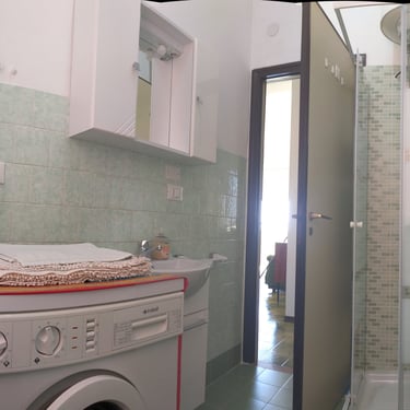 Bagno con finestra, doccia, bidet, lavatrice e Boiler elettrico per acqua calda.