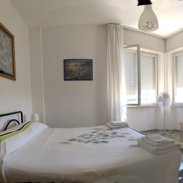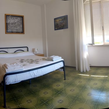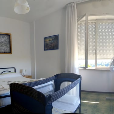 Camera matrimoniale con doppia finestra, una vista sul mare ed una su vista campagna marchigiana versante Loreto/Recanati. Nella camera matrimoniale si possono aggiungere un letto singolo e lettino da campeggio.