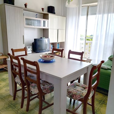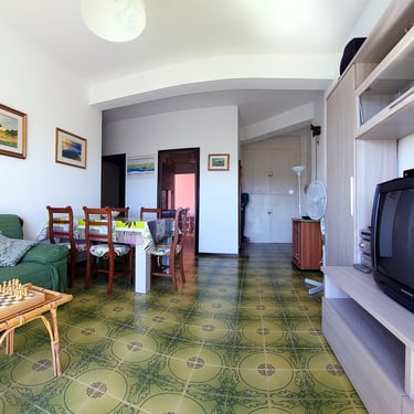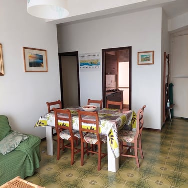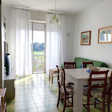 Sala da pranzo con balcone vista mare e parco, è fornito di divano, WiFi, TV, stereo, tavolo allungabile per 6 o più persone.