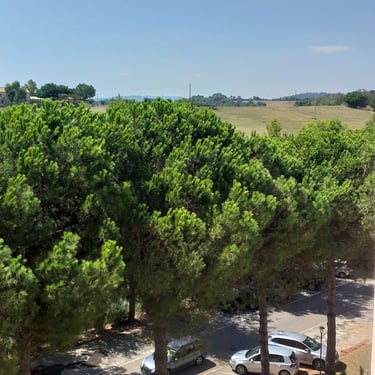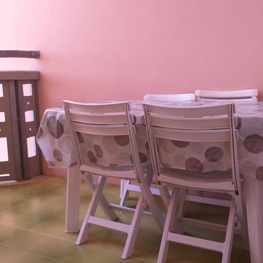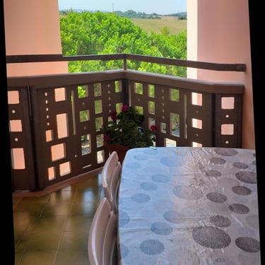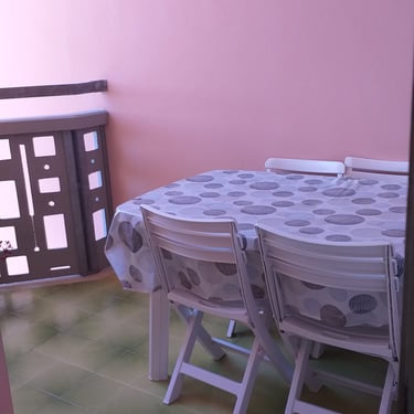 Piccolo terrazzo adiacente alla cucina, dotato di tavolo con sedie per mangiare all’aperto e stendino per asciugare i panni